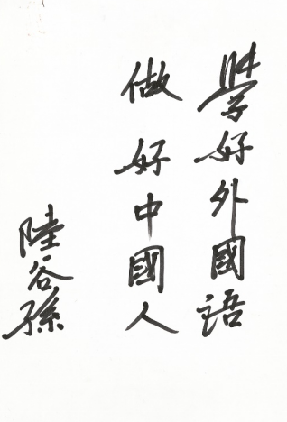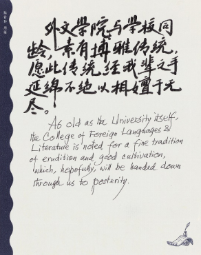 这是陆老师大约90年代末期的寄语,简简单单,再朴素不过的十个字里,陆老师向外文学院师生提出了为学、为人的准则,看似朴实无华,却需要一生去努力实践。这句话后来口口相传,成为外文学院的院训。