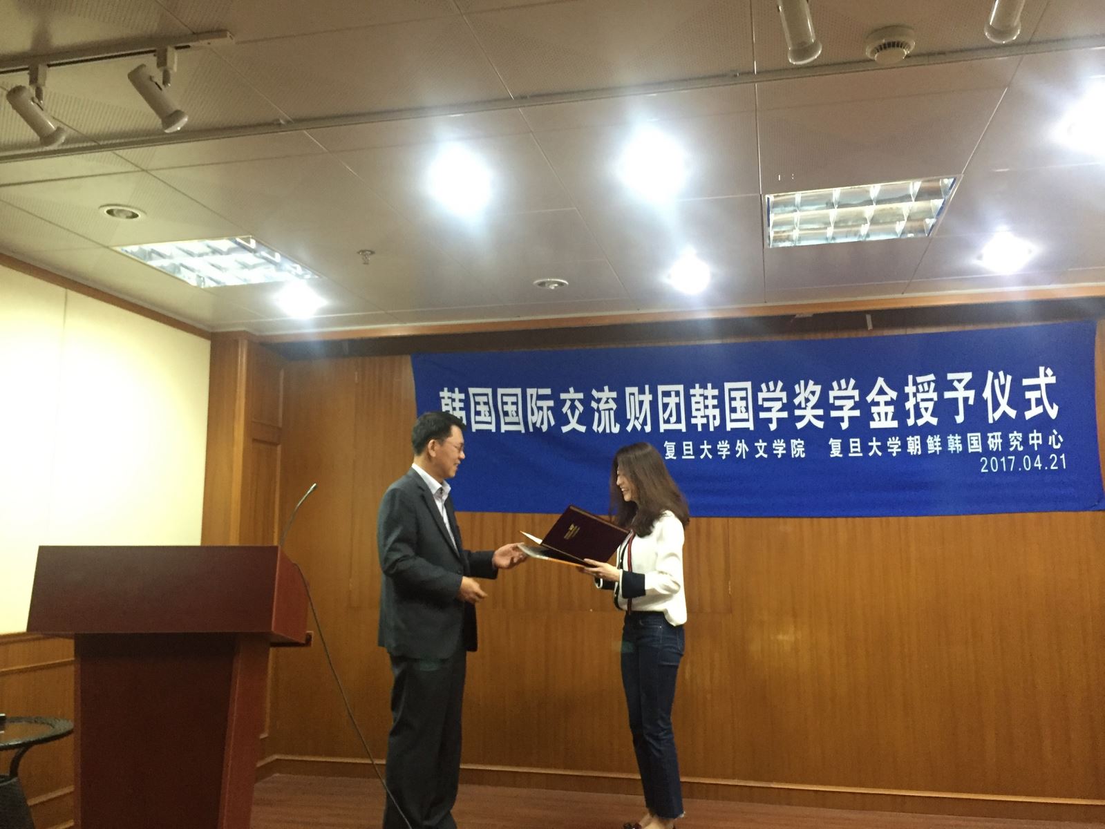 2017年4月21日上午,韩国国际交流财团韩国学奖学金授予仪式在复旦大学文科楼209会议室如期举行。