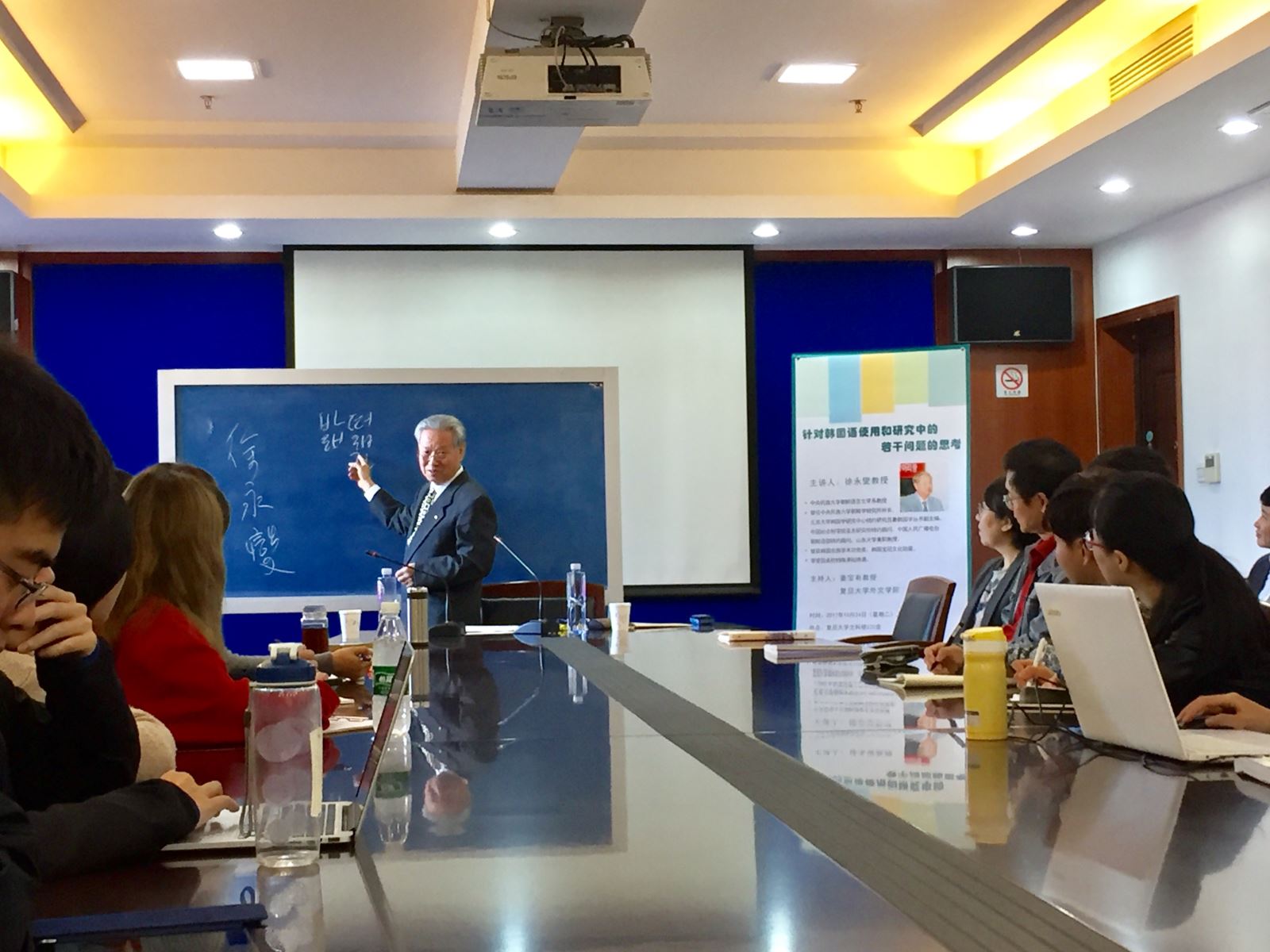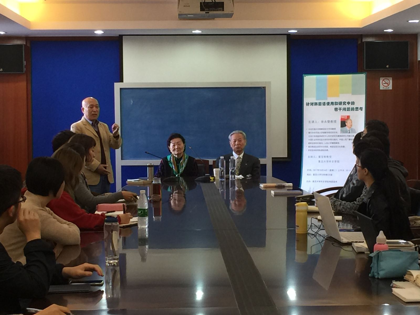 2017年10月24日上午,中央民族大学朝鲜语言文学系徐永燮教授应邀做客复旦大学,在复旦大学文科楼220报告厅为韩文系师生带来精彩的讲座。徐永燮教授以“针对韩国语使用和研究中的若干问题的思考”为主题开展讲座。讲座由韩文系姜宝有教授主持。