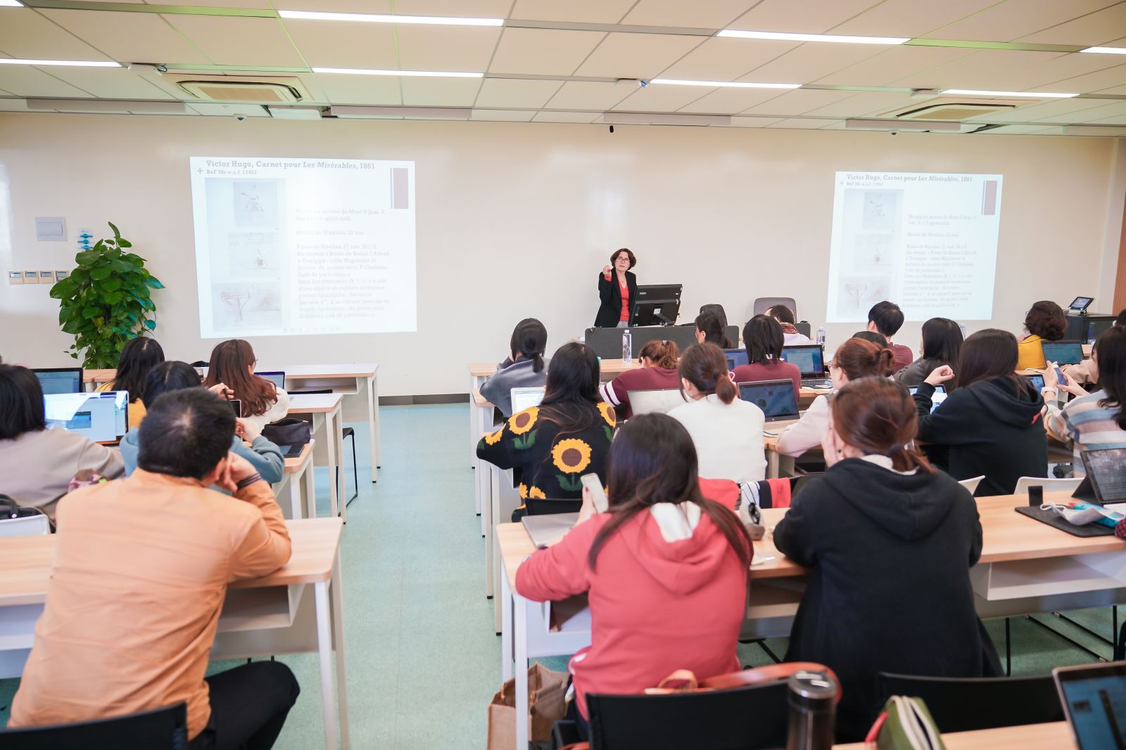 2019年10月29日上午,复旦大学外文学院法文系成功举办了“天才的内心 ——雨果的绘画与文学”主题讲座,主讲人是法国格诺布尔·阿尔卑斯大学文学教授Delphine Gleizes女士。法文系主任袁莉老师主持了本场讲座,上海市明珠美术馆提供技术支持。
