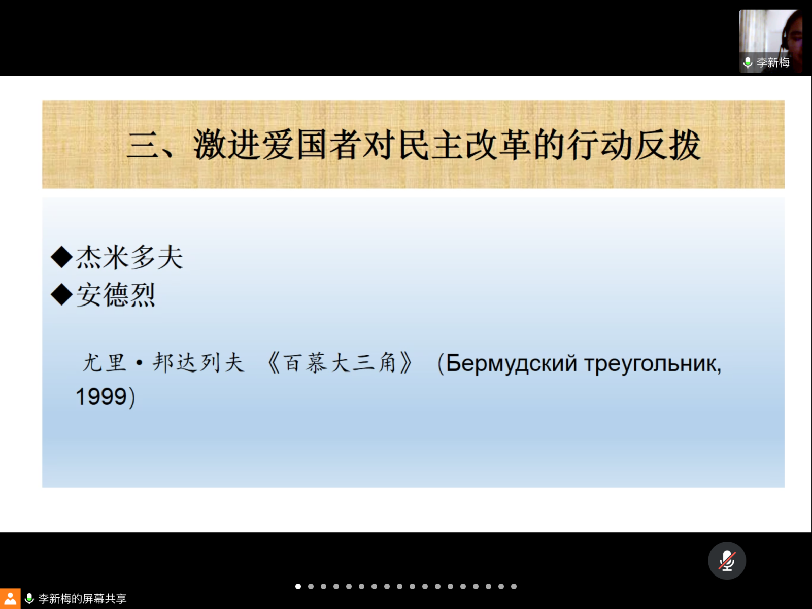 2020年5月19日,复旦大学外文学院俄文系2020年校庆学术报告会暨专题讨论会“俄苏文学与翻译的中国视角”成功在线举办。会议由俄文系主任姜宏教授主持,俄文系教师赵艳秋、李新梅分别进行报告。60多位师生参会。