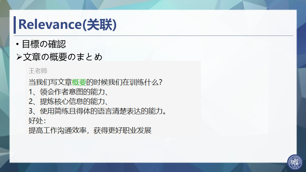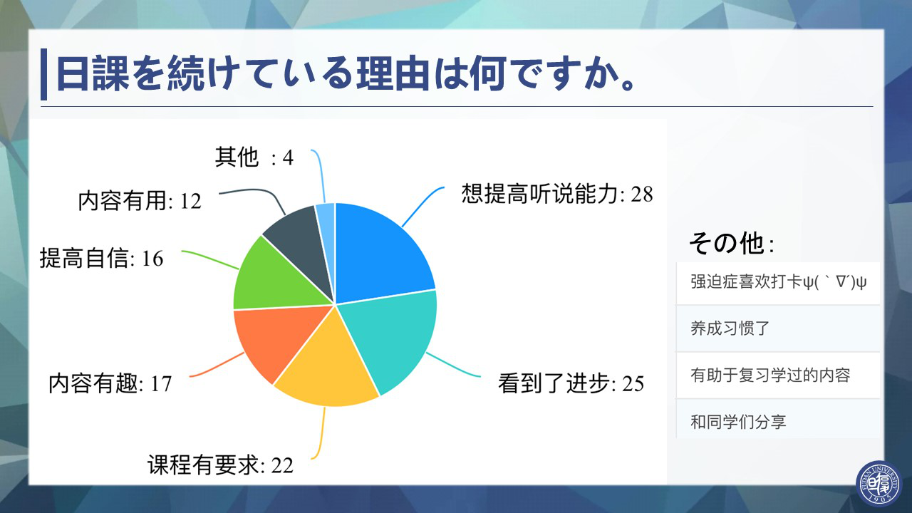 王菁洁老师以“在线课程的实践报告——以作业任务为主”为题,介绍了《基础日语2》课程中使用的“朗读打卡”以及“比较中日文化”、“日语配音”等作业任务的实践经验。王老师指出在线授课难以及时了解学生的掌握情况,因此作业任务是非常重要的环节。首先为了确认学生的学习效果,设计了基于课件视频的基础练习。其次为了引导学生自主探究,设计了开放性任务。同时还指出在线课程布置任务时要注重引导学生的学习动机,让学生爱学愿做。王老师通过约翰·M·凯勒的ARCS模型介绍了布置任务时的心得,表明通过引导,学生完成任务的意愿较高、学习效果较好。