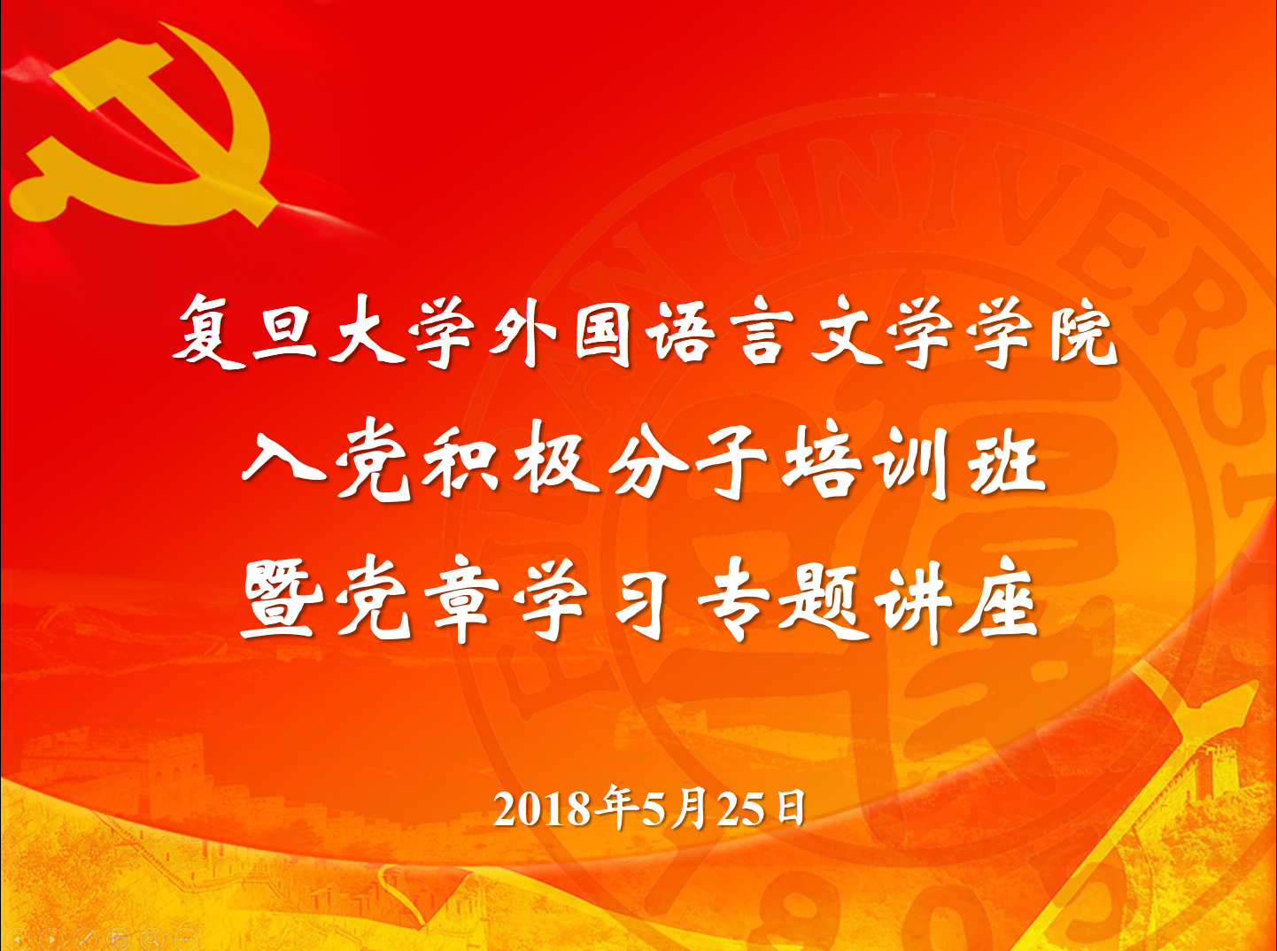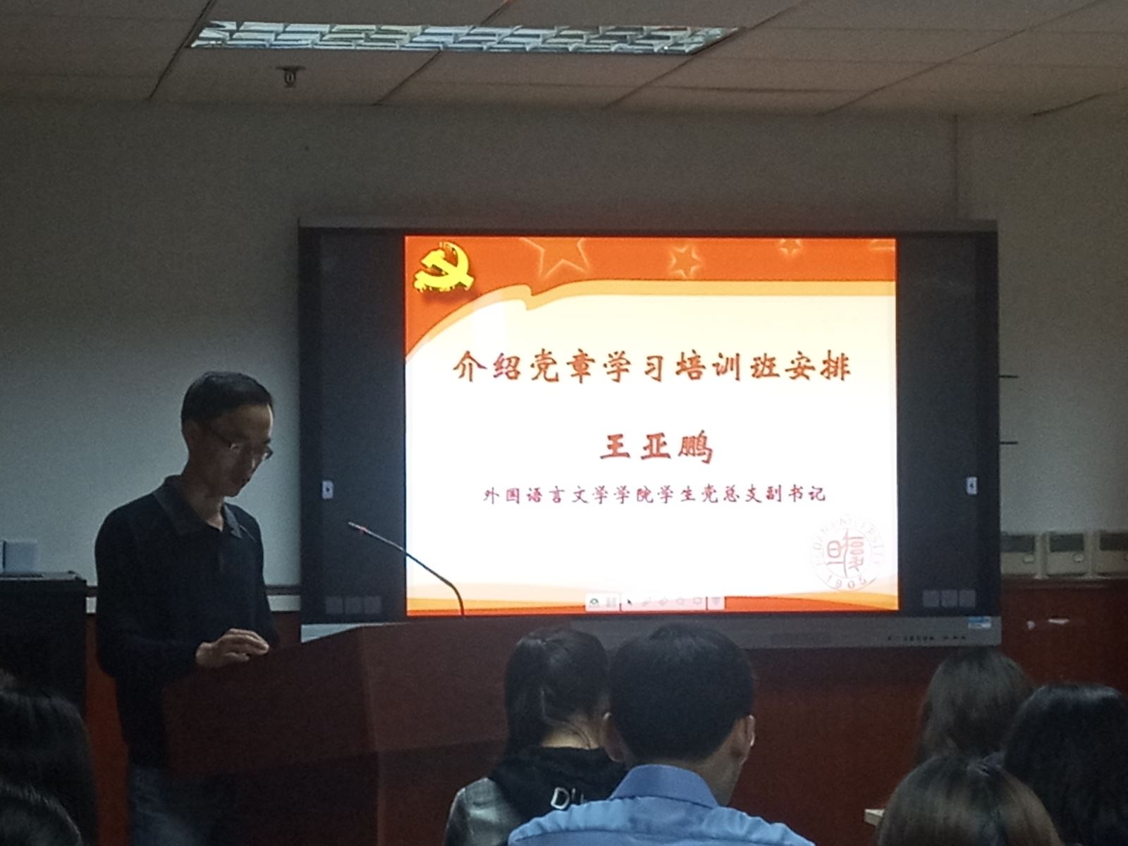 王亚鹏介绍了培训方案、日程安排与学习要求。本期党章学习培训班是外文学院学生党总支继续探索和实践“党员全周期培养”的重要环节,是党的十九大后、中国特色社会主义进入新时代以来学院举办的第一期党章学习培训班,又正值马克思诞辰200周年和《共产党宣言》发表170周年,培训班面向递交了入党申请书、经过了党章学习小组初步学习,经支部考察入党动机端正、具备理论学习基础,各方面表现优秀的同学,重点围绕端正入党动机、打好理论学习基础、形成党员意识、塑造能力素质四个维度,设计了巩固理论、主题研讨、追寻足迹、成果展示四大版块的学习实践活动,力求节奏紧凑、重点突出、内容丰富、取得实效。