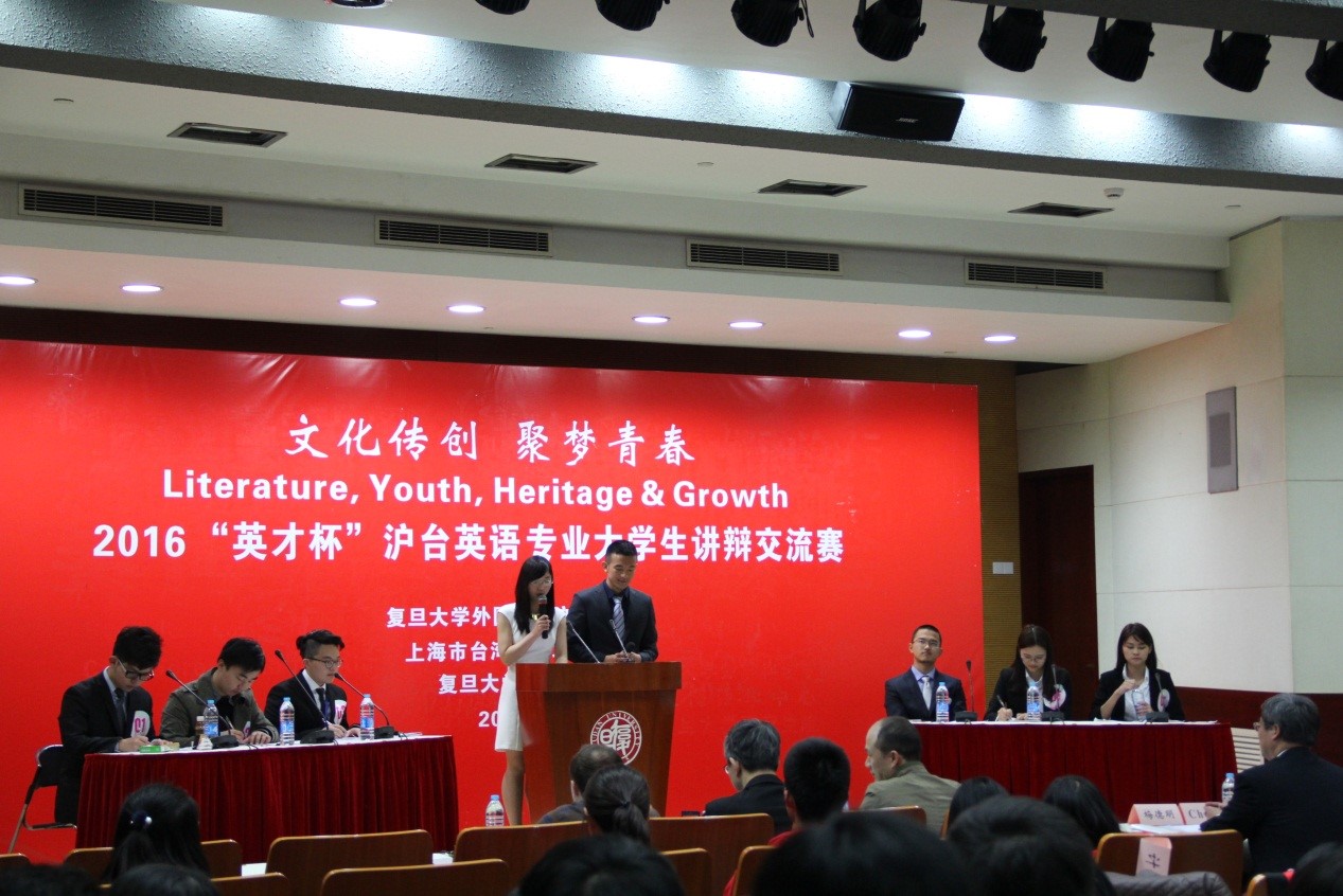 2016年3月31日至4月4日,首届“英才杯”沪台英语专业大学生讲辩交流赛于复旦大学举行,本次大赛主题为”Literature, Youth, Heritage and Growth”,由leyu乐鱼官方web站登录入口、上海市台湾同胞联谊会、复旦大学出版社共同主办。来自复旦大学、上海交通大学、同济大学、华东师范大学、上海外国语大学及台湾大学、台湾政治大学、台湾师范大学、东吴大学等沪台两地九所高校的学子齐聚复旦,切磋技艺,沟通交流,增进感情。