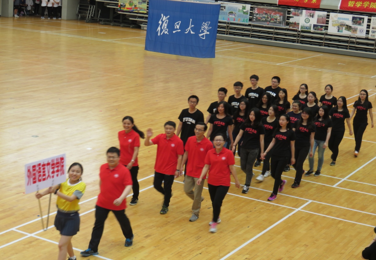 2016年5月20日上午,复旦大学第56届校运动会在正大体育馆隆重举行,我院代表队出席了开幕仪式。外文学院方队在学院党委副书记赵昕老师的带领下,雄赳赳、气昂昂地走过大会主席台,接受了学校领导的检阅。工会副主席白冰老师、刘亦春老师、工会文体委员郭一诚老师及学工组王亚鹏老师作为教工代表出席了入场仪式。