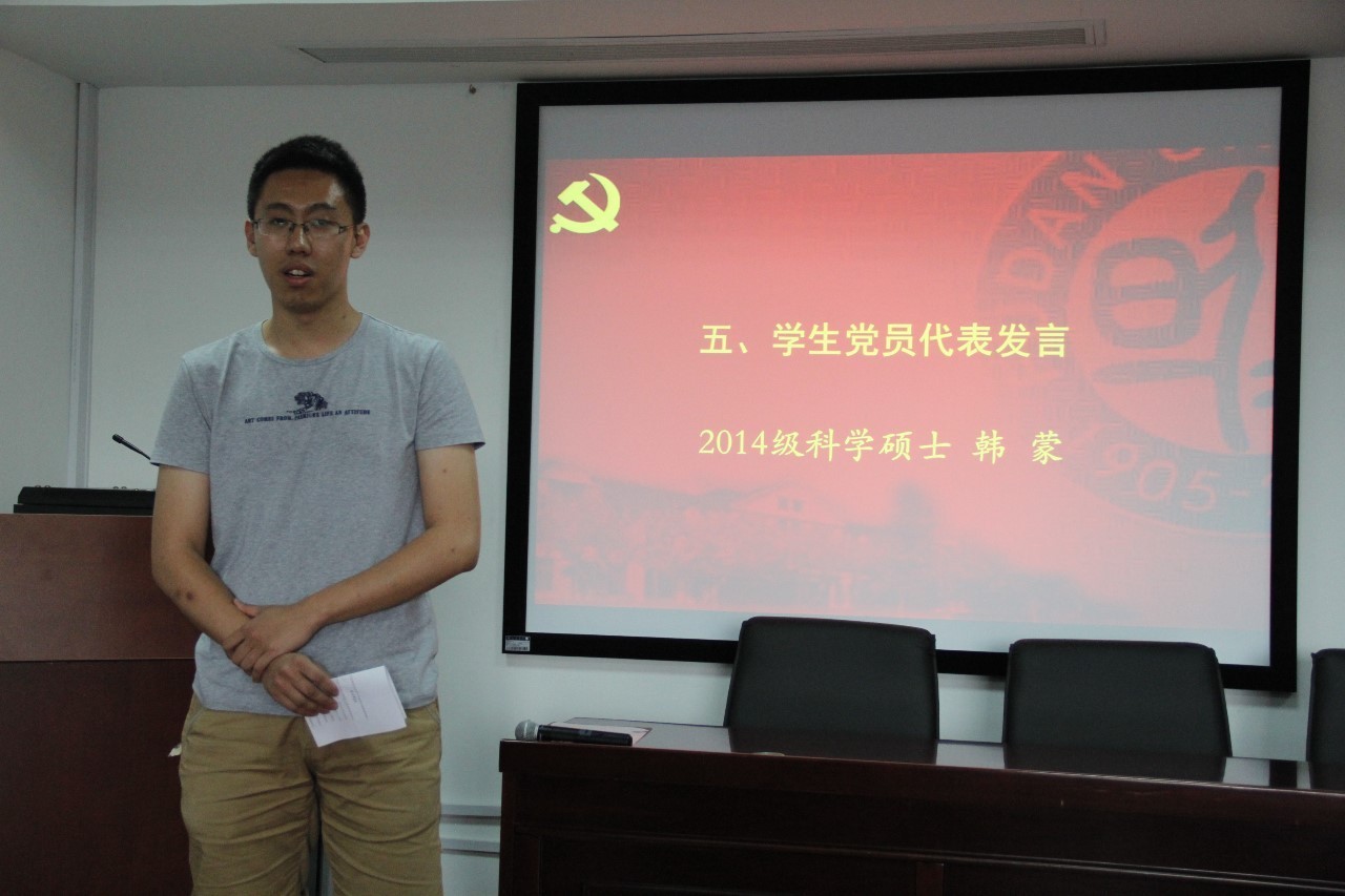 学生党员代表、2014级科学硕士研究生韩蒙同学代表全体预备党员发言,他从对入党誓词的认识谈起,表示成为一名党员是新身份的开始,意味着更多的责任,要求付出更多的努力,要用行动去诠释党员的称号,在党组织的大熔炉里时刻接受教育和考验,更好地挖掘自己的潜能,不断学习,不断充实和完善自我,奉献自己的一切,为共产主义理想终生奋斗。