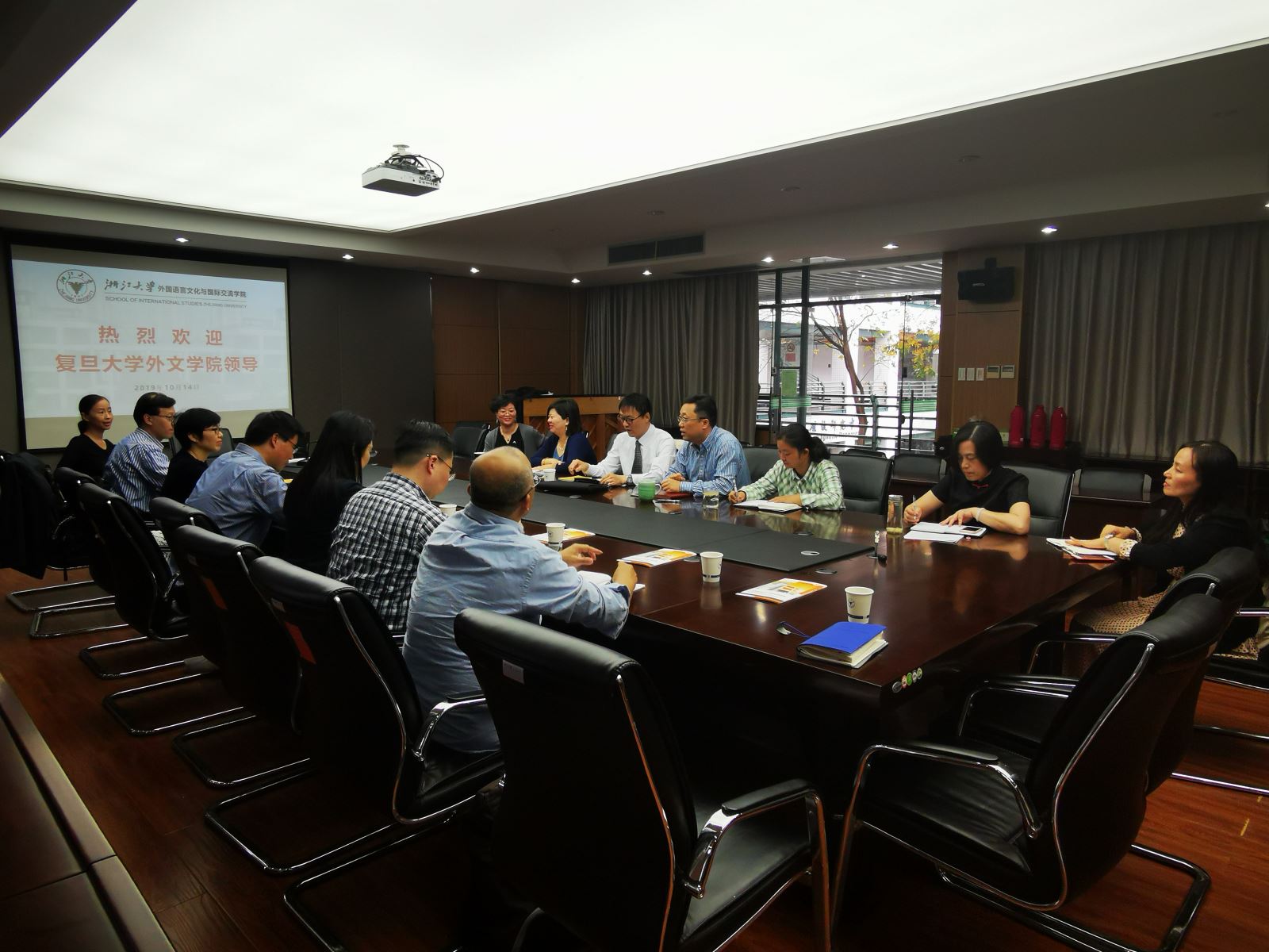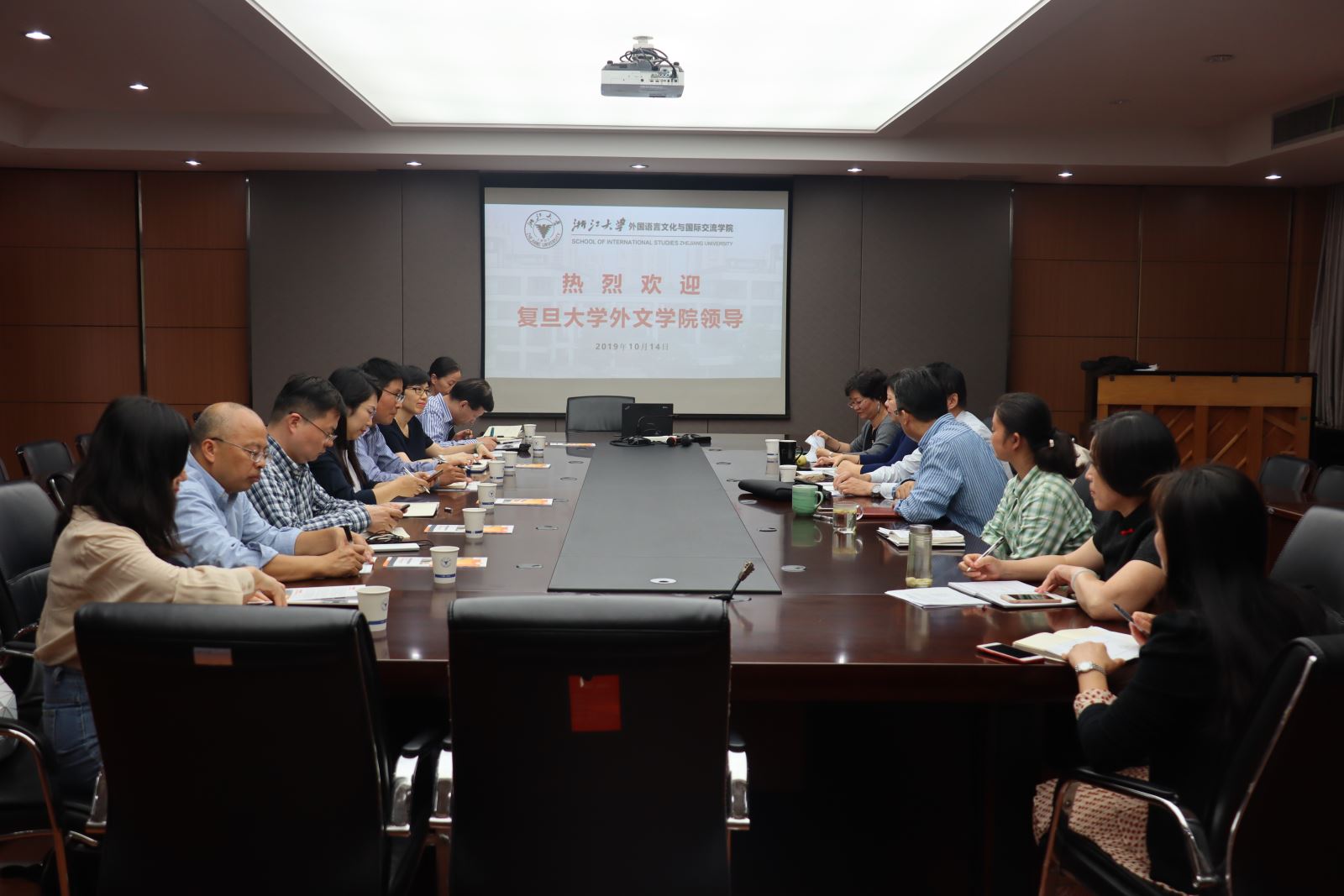 2019年10月15日,外文学院院长高永伟、党委书记罗英华带领党政班子赴浙江大学外国语言文化与国际交流学院调研学习。浙大外院院长程工、党委书记姚信等党政领导参加座谈。